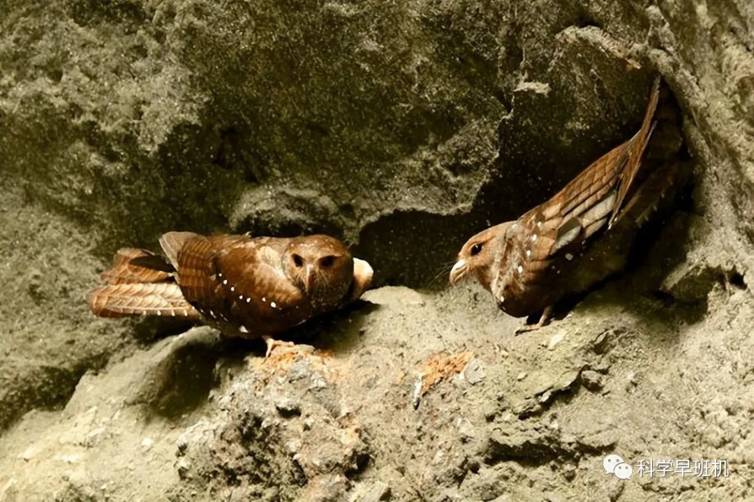 这一看不要紧,一看便被萌化了。原来在山洞的伸出栖息着一窝深褐色带有斑点的鸟类,它们就是油鸱鸟。一般人们简称为油鸱。油鸱外表圆润矮小,眼神天真单纯,与之前凄厉的惨叫形成鲜明的对比。