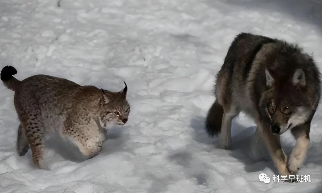 虽然野狼不在猞猁的菜谱之内,但是猞猁会像山大王一样定期清除领地内的野狼数量,截取有限的资源。