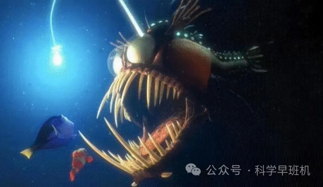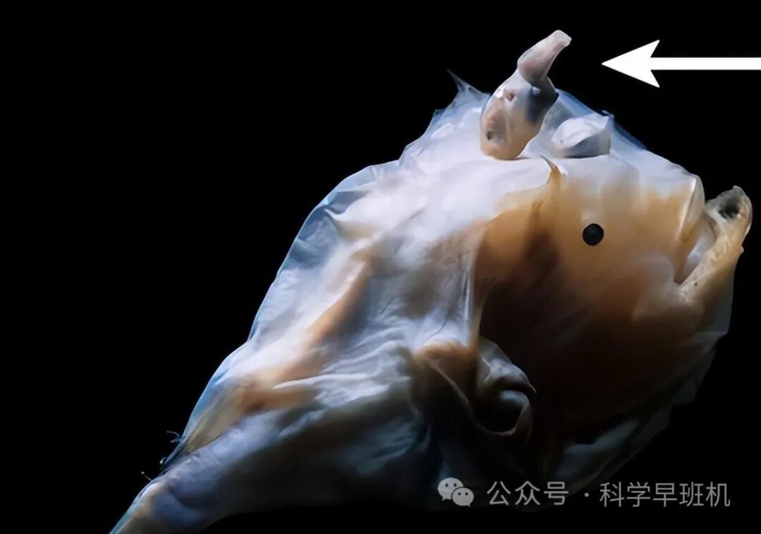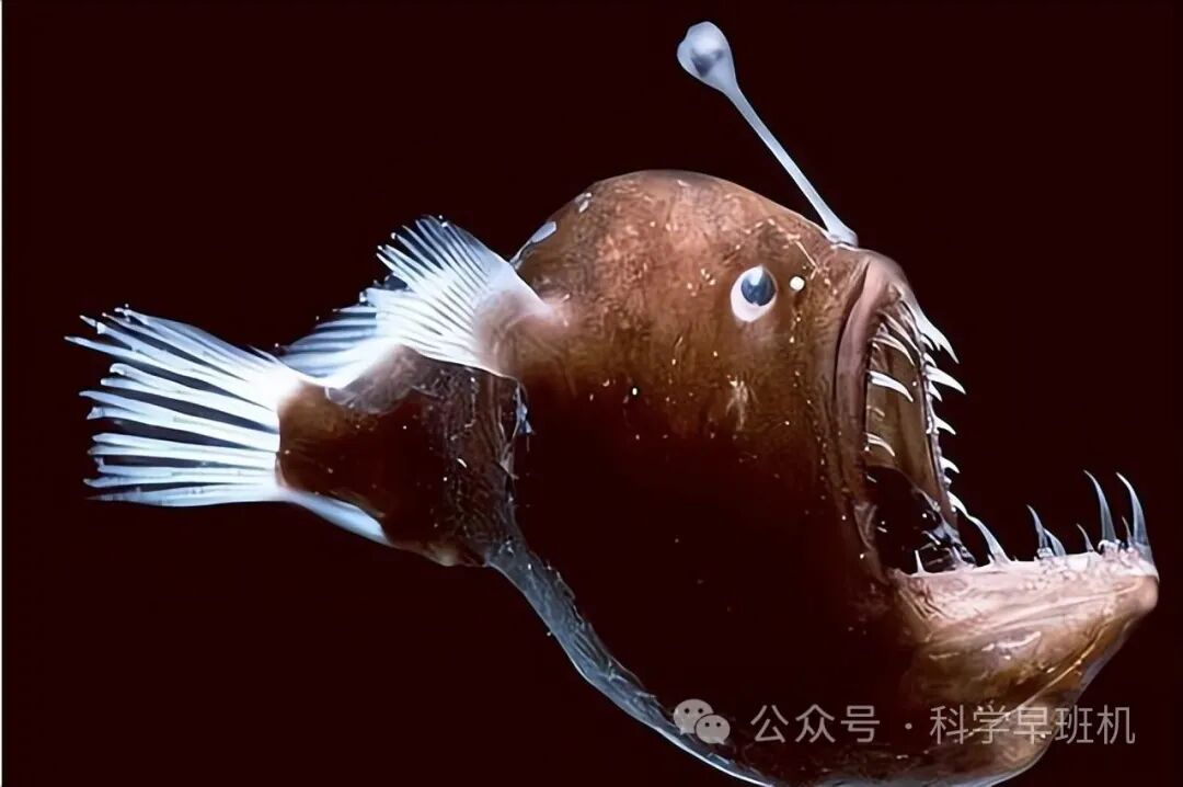 原来是因为鮟鱇鱼的结构十分特殊,头顶长有一个小肉球,在鮟鱇鱼的第一背鳍加持下,使其就像小灯一样悬挂在脑袋上方。别看这个肉球小,里面遍布了腺细胞,能够在化学作用下分泌信息素,以及产生独特的亮光。鮟鱇鱼第一背鳍棘在捕食的时候,会自动变成了一根生物诱捕器。