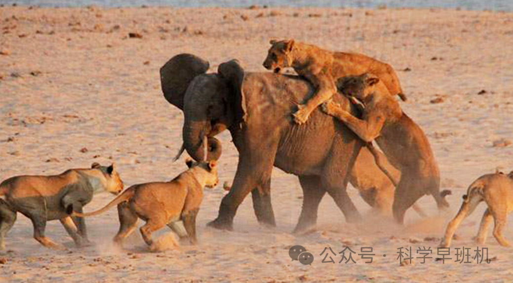 不过体型小一点还未长成的大象,也会成为一些食肉动物的捕食对象,但这些动物必须同是群居性才有胜算。曾经就有人在非洲草原上看到狮群围攻一头5吨大象,最后大象体力不支倒地成为了狮群的午餐。
