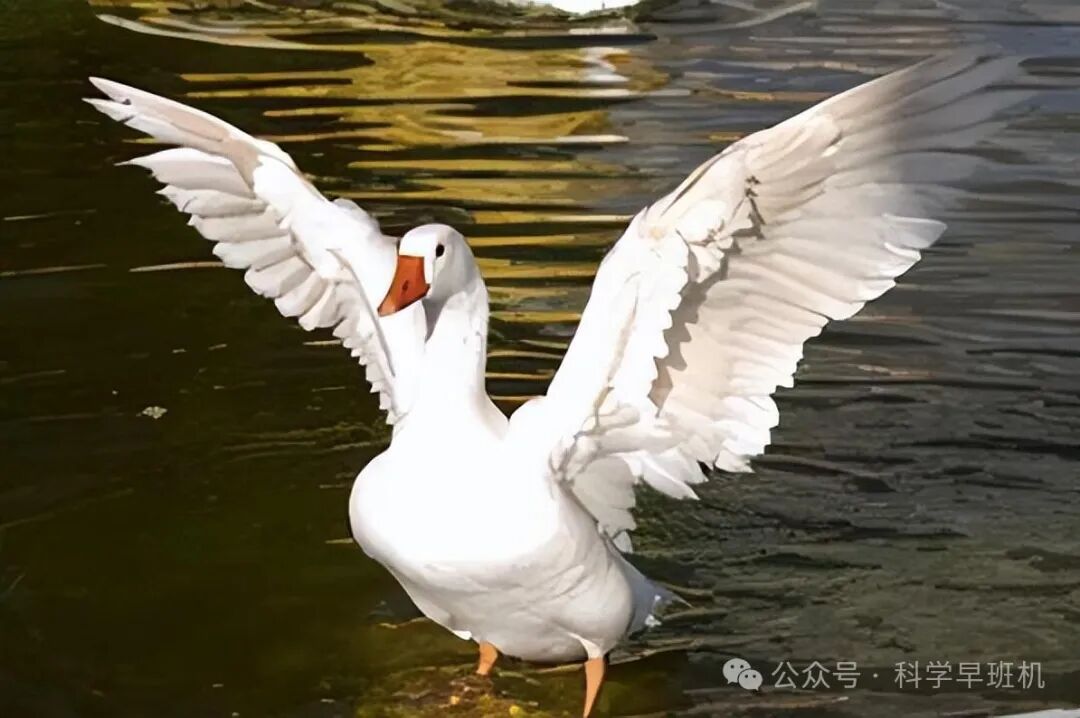 鹅擅长在水中浮游,别看水面之上的大白鹅一副优雅从容地样子,全靠水中的两只鹅掌像个螺旋桨一样不停地摆动,充当动力。大白鹅喜欢成群结队地生活,交流全靠“吼”,旁若无人地发出“呱呱呱”的聒噪声。