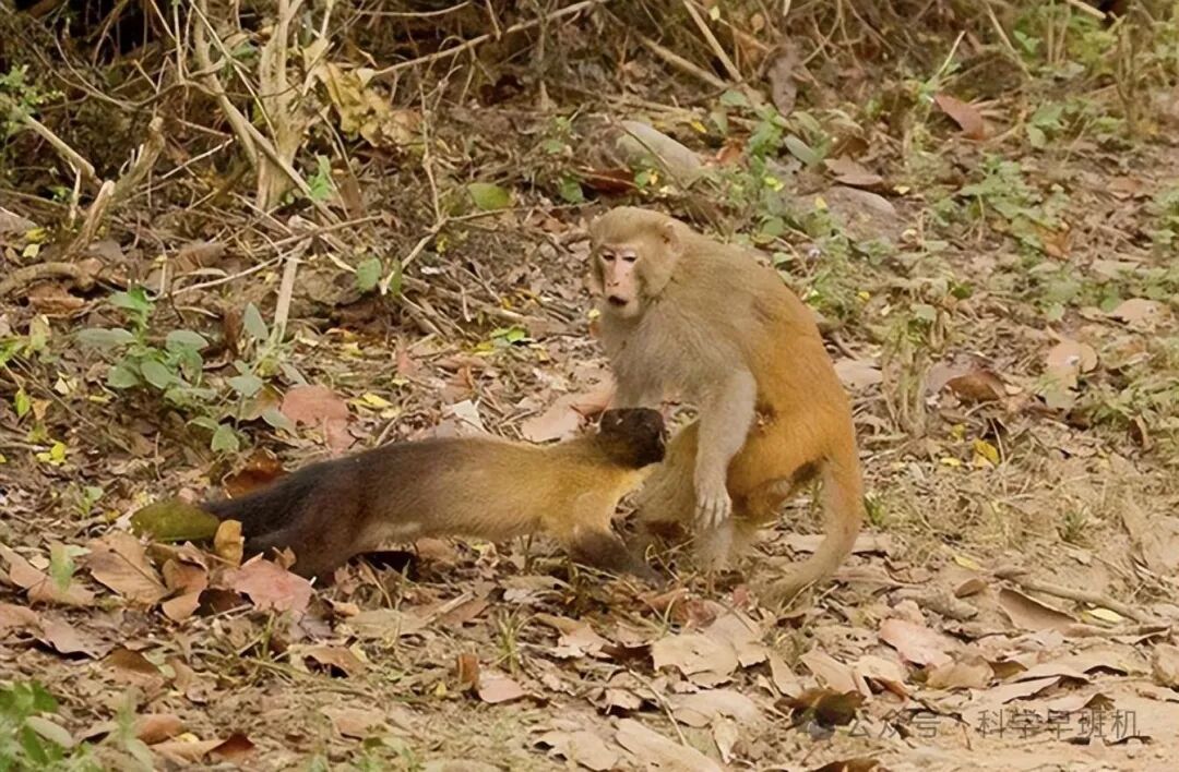 无独有偶,人类的摄像头拍下了黄喉貂袭击猕猴的全过程。一只猕猴慢悠悠地在山道上突遭黄喉貂的“飞扑”。等猕猴反应过来的时候,已经被黄喉貂的利爪和尖牙牢牢地钳制住了。