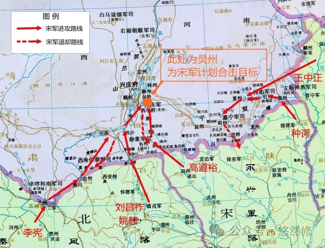 王中正出鄜州,经夏州、宥州奔灵州。种谔出绥德城,至夏州与王中正会师,然后合兵攻向灵州。高遵裕出庆州,经清远到灵州。刘昌祚出泾原(受高遵裕节制),沿葫芦河北上,到灵州与高遵裕会师。李宪这一路属于机动力量,如果其它几路进攻灵州顺利,李宪就向西进攻西凉府,如果其它四路攻势受阻,他则前往增援。