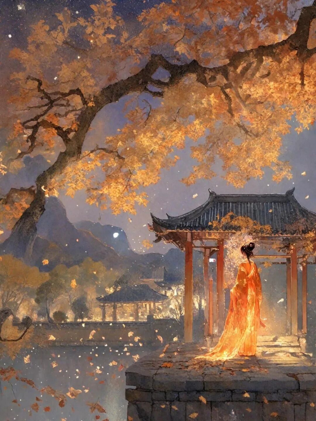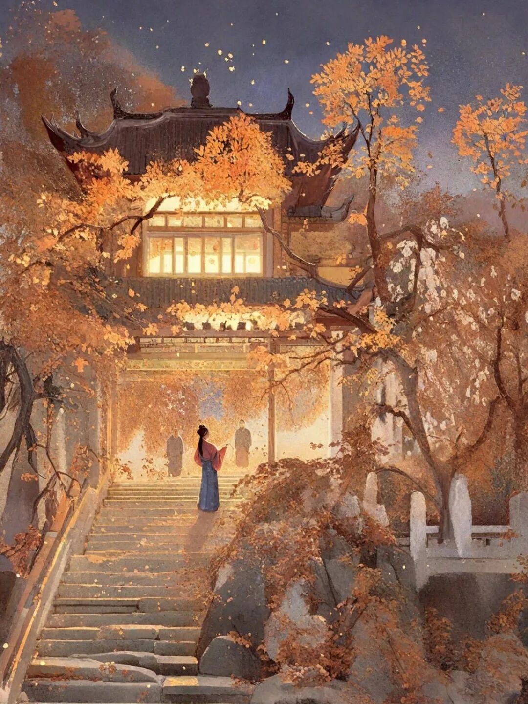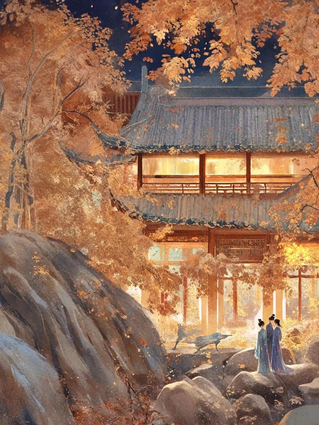 释义:这幅精美的山水画具有无与伦比的艺术效果,实是世间少有,不知费了画家多少心血。