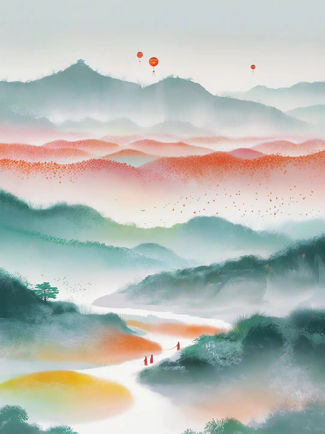 释义:随着秋天的到来,炎阳随飘逸的云朵散去,缕缕凉风迎风而起。