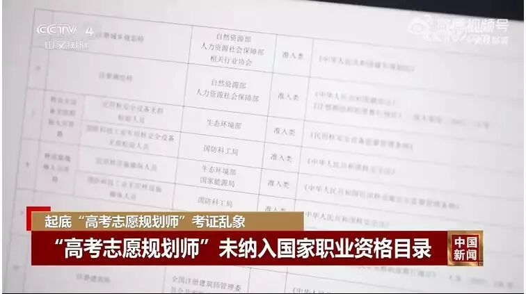 记者查阅人力资源社会保障部公布的最新版《国家职业资格目录》发现,高考志愿规划师并不在其中。