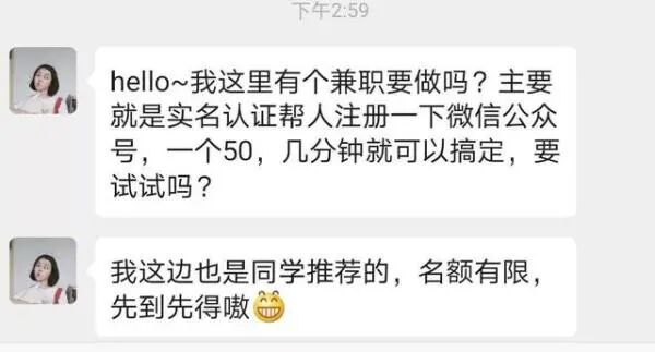 这份兼职的内容是:进行身份证实名认证、绑定银行卡,帮“上家”注册微信公众号。