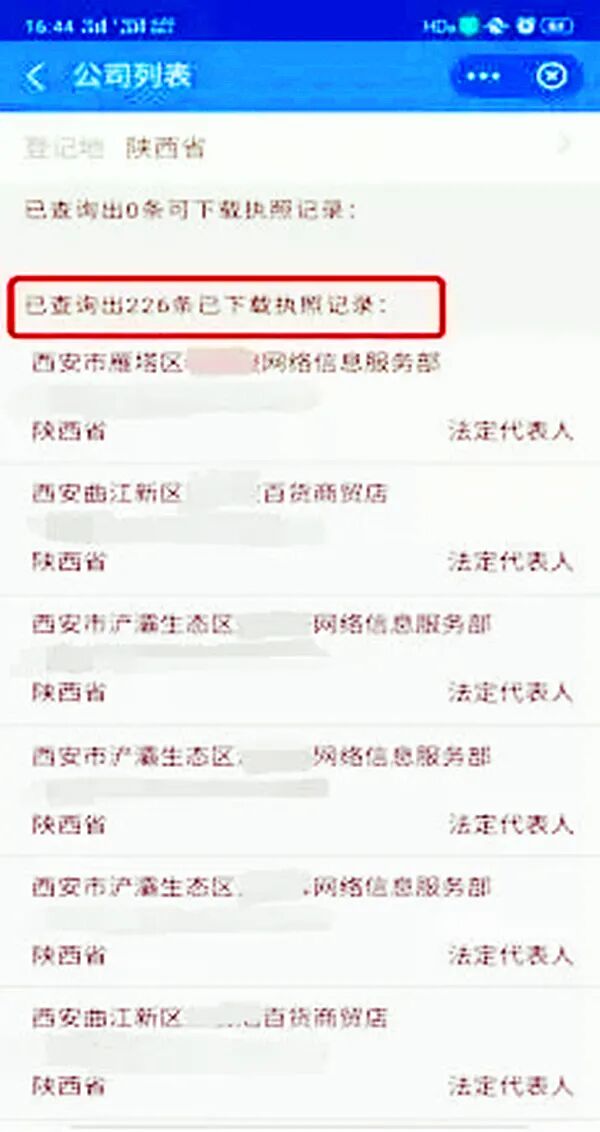 这天,小王的一个好朋友小何告诉他自己突然成为了几家公司的“老板”,小王对此也感到好奇和诧异,便根据朋友的描述在网络上查询了一下自己的“电子营业执照”,不查不知道,一查吓一跳,结果显示,他名下有226条已下载的执照记录,也就意味着他成了226家公司的“老板”。