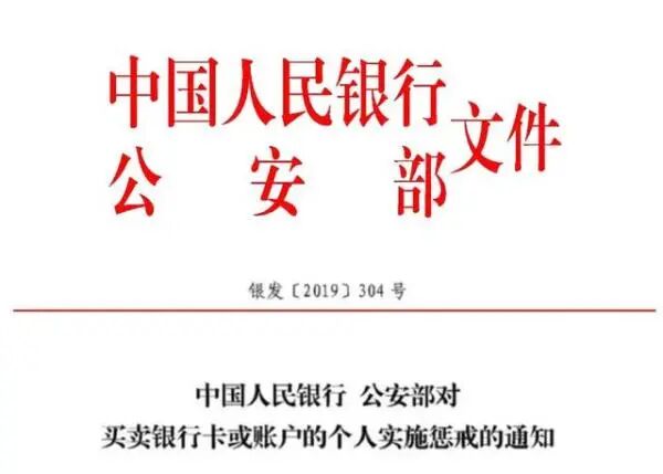 2019年12月16日,公安部、中国人民银行联合下文《中国人民银行公安部对买卖银行卡或账户的个人实施惩戒的通知》(银发〔2019〕304号),联手惩戒贩卖个人银行卡和企业对公账户行为。