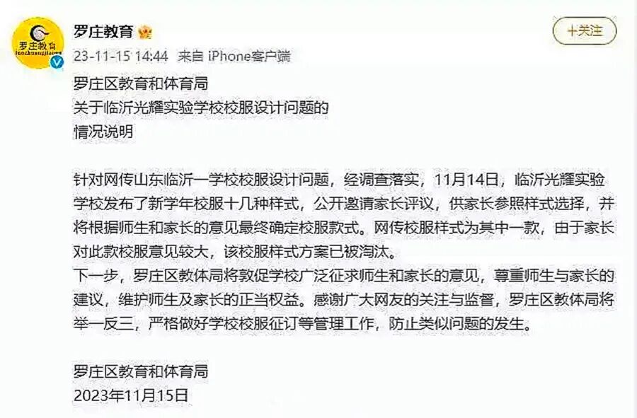 罗庄区教育和体育局于11月15日发布了一份关于临沂光耀实验学校校服设计问题的说明:由于家长意见大,该校服已被淘汰。
