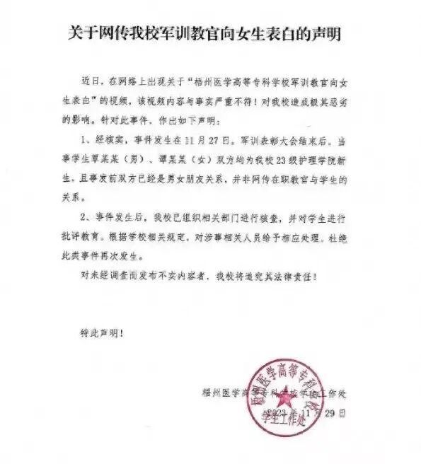 随着事情在网络上的发酵,该学校也发表了声明回应,表示视频中的两人均为该学校23级的新生,并且两人在这件事情之间就已经确立了男女朋友的关系,并非是网传的教官和学生的关系。