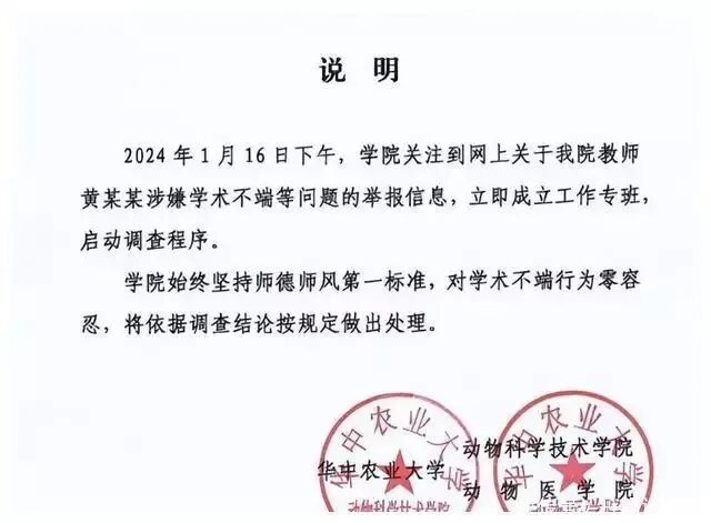 好在于发文前,学校方面传来了新的消息,华农方面表示,关于黄教授的学术假造,经过初步调查,基本上可以认定确有其事。至于那几个学生,学校方面已经成立了新的导师组,让学生们继续完成学业!
