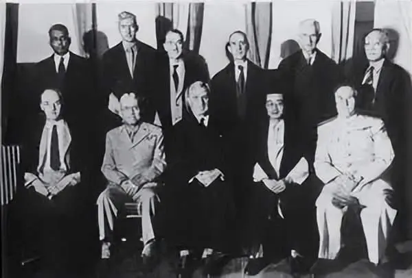(东京审判法官团:前排中为首席法官韦伯,前排右二为中国法官梅汝璈)