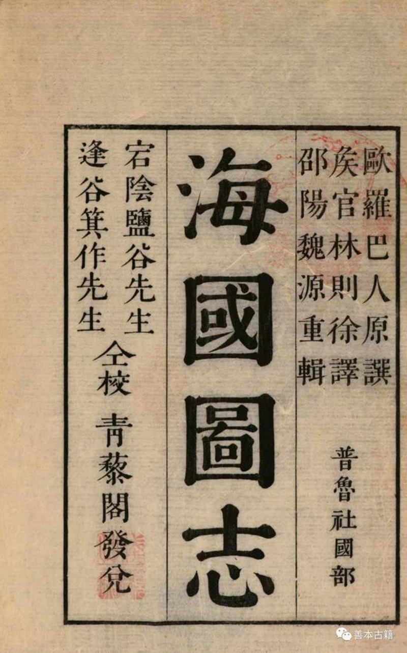 《海国图志》是魏源在林则徐的委托和帮助下撰写的世界概况介绍,其开篇就提出了中国应对外部世界知己知彼,学习别人的先进技术才能克敌制胜,此即著名的“师夷长技以制夷”的思想。然而,这本巨著在国内很快就成为禁书。数年后,《海国图志》传入日本,因其中含有介绍基督教的内容,先是被幕府禁了3年。但美国“黑船来航”后,渴望了解世界的幕府立刻解禁了此书,并且要求各级官员务必熟读之。日本全国上下顿时掀起了“睁眼看世界”的热潮。仅1854—1856年期间,日本刊行的《海国图志》就有20多种版本。