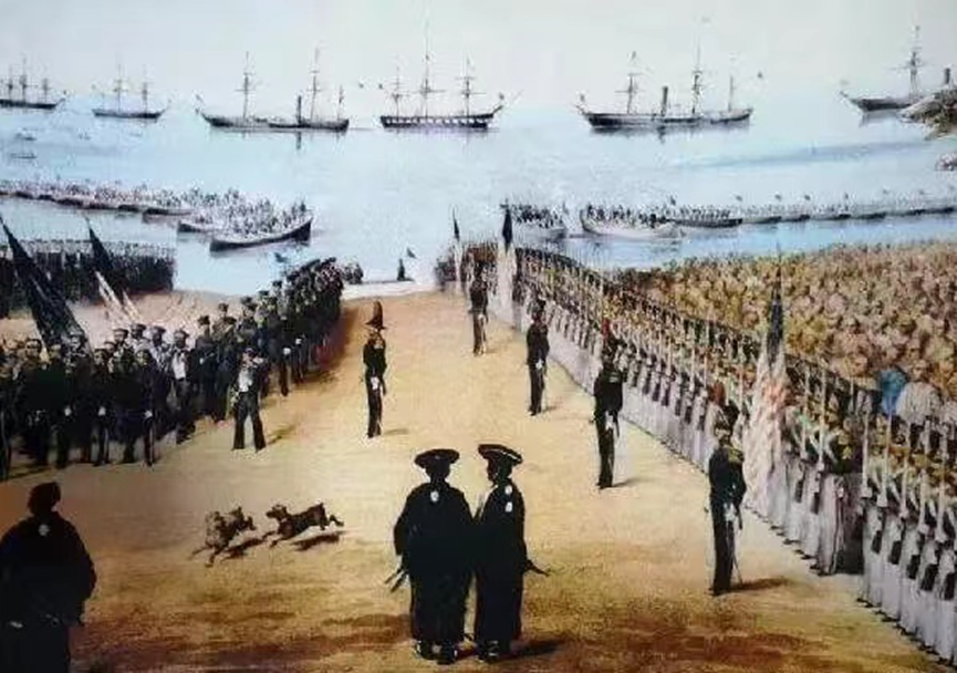 中英《南京条约》签订9年后,日本也同样面临被迫开国的命运。只不过这次以武力相胁迫的舰队不是来自英国,而是来自美国。日本并没有像清廷那样进行抵抗,而是敷衍了一年赚回一点面子后,次年还是在同《望厦条约》相似的不平等条约《神奈川条约》上签字。