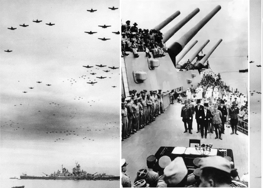 1945年8月15日正午,日本天皇宣告向同盟国无条件投降的诏书通过电台播出。9月2日上午9时,日本投降仪式在东京湾的美国战列舰“密苏里”号主甲板上举行。日本外相重光葵代表日本天皇和政府、陆军参谋总长梅津美治郎代表帝国大本营先后在投降书上签字,随后由由盟军最高统帅麦克阿瑟上将签字,接下来美国代表尼米兹海军上将、中国代表徐永昌上将、英国代表福莱塞海军上将、苏联代表杰列维亚科中将以及澳、加、法、荷、新西兰等国代表依次签了字。这标志着第二次世界大战正式结束。