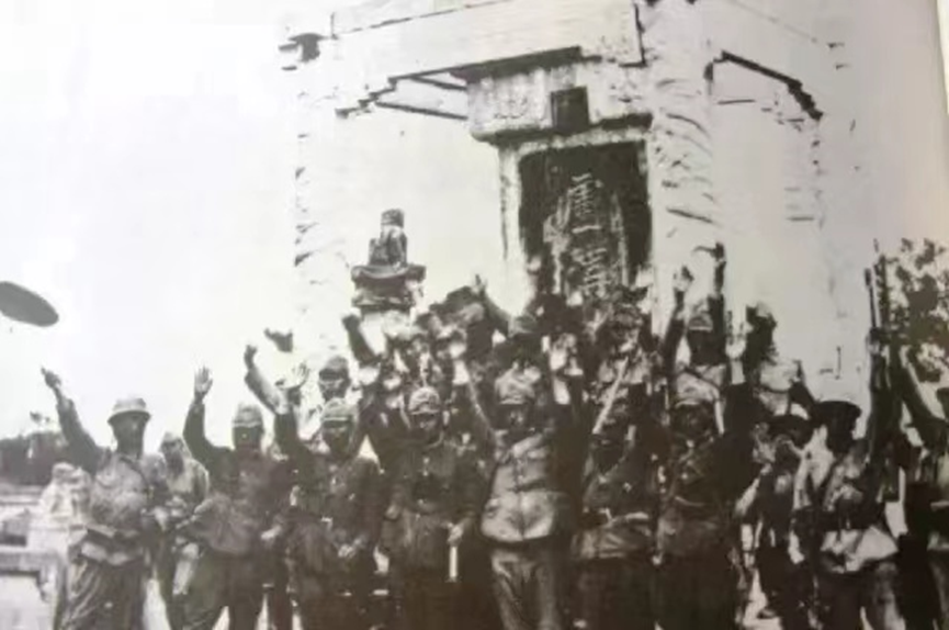 (日军在卢沟桥东头卢沟晓月碑前庆祝胜利)