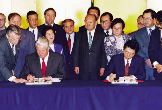 1993年10月11日晚,叶利钦终于实现曾两度推迟的访日,12—13日与细川首相举行两轮会谈,13日双方发表了《东京宣言》和《经济宣言》。《东京宣言》指出:两国首脑就“四岛归属问题”进行了谈判,一致同意以“两国间的诸文件”及“法和正义”为基础继续进行缔约谈判。《东京宣言》为日俄领土问题谈判提供了新的立足点。