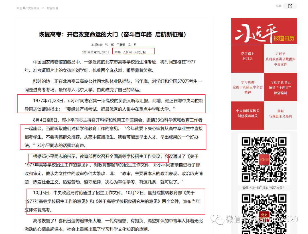 另外根据当时的决策流程,邓小平把这个决定报送华国锋等批转和集体讨论,是必要的行政程序。而这一点和邓小平作出这个恢复高考的决定并不矛盾。