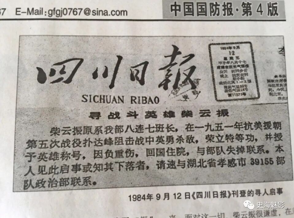 起初,这条寻人启事并没有引起柴家人的注意。因为柴云振这个名字是他本人的原名,入朝参战的时候,他已经改名叫“柴云政”。只是因为后来统计战功的时候,柴云振已经回国养伤,一时没有找到,工作人员就按照原有的部队名册进行了统计,使用了原名。