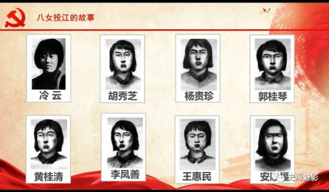 注:八位投江牺牲女烈士的名字依次是:指导员冷云,班长胡秀芝、杨贵珍,战士郭桂琴、黄桂清、王惠民、李凤善和被服厂厂长安顺福。其中王惠民仅有13岁!
