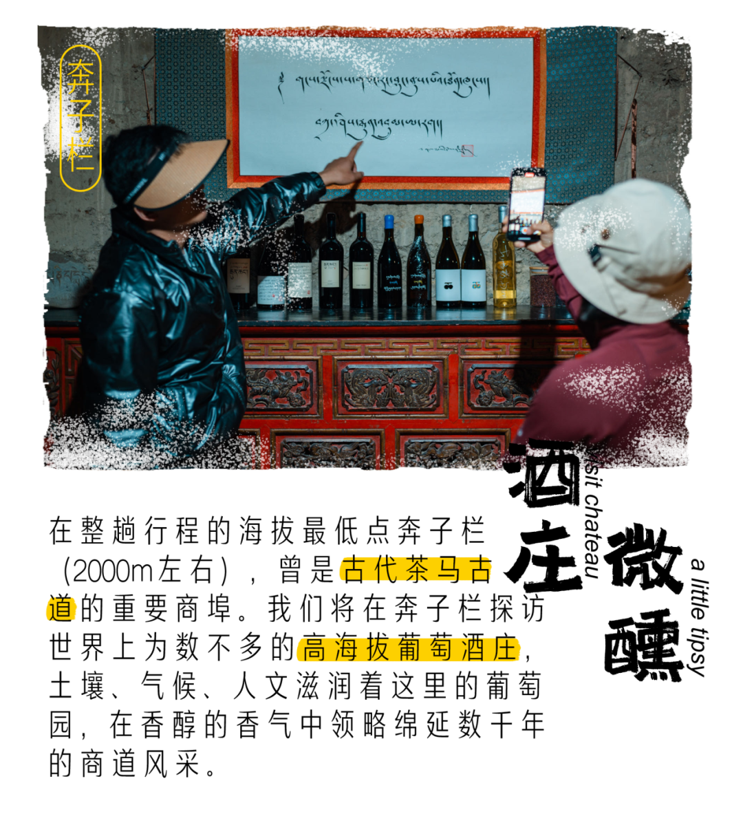 见证梅里日照金山,将好运保留一整年。中午造访静谧神圣的小众藏地寺庙——东竹林寺,了解宗教文化。中午抵达途中海拔最低点,2000米左右的奔子栏,享用农家乐午餐。午餐后参观当地酒庄,奔子栏地处干热河谷地段,是云南非常重要葡萄酒产区。这里有外地人经营的精致酒庄也有本地人经营的家庭酒庄,我们将走进大小酒庄,了解藏地酿酒文化的同时品鉴不同种类的美酒。