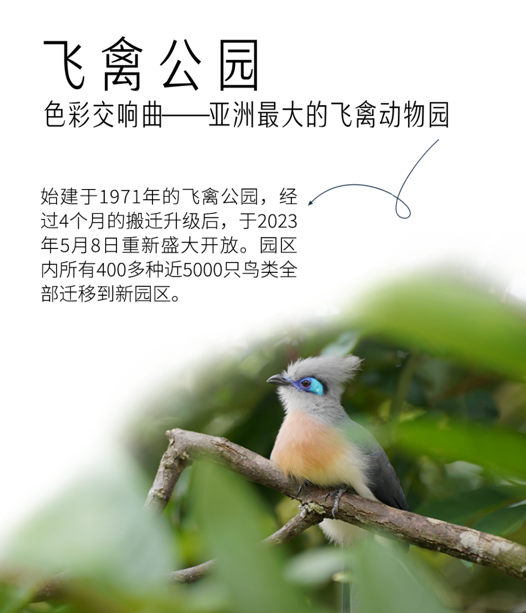 第二天我们九点半出发前往“色彩交响盛宴”——新加坡飞禽公园。始建于1971年的飞禽公园于今年进行了搬迁升级,2023年5月份园区内所有400多种近5000只鸟类全部迁移到新园区,届时我们不仅可以在还原鸟类原生环境的密林中穿梭探索,还将近距离观察鸟类行为,了解濒危飞禽品种的保育知识。