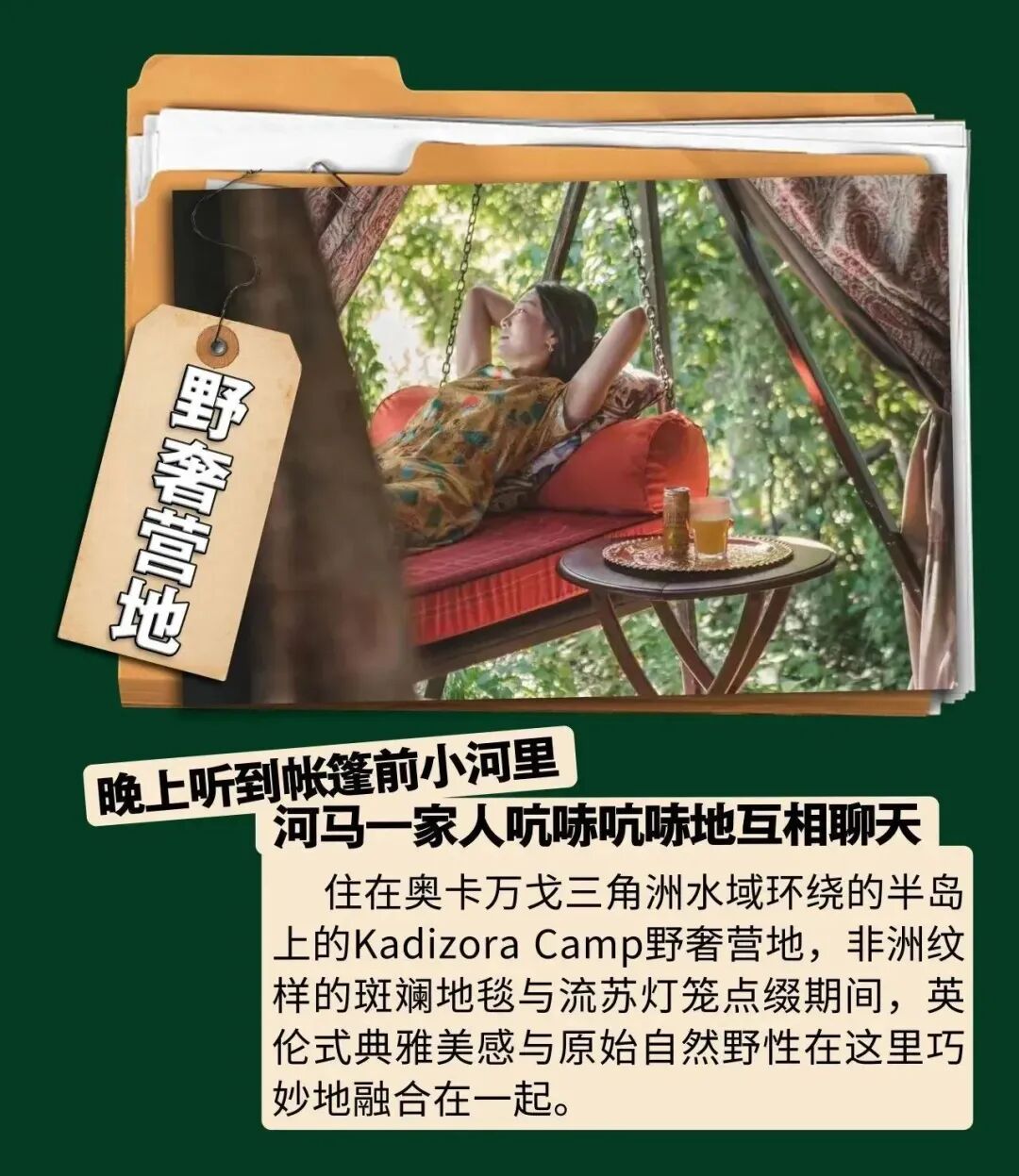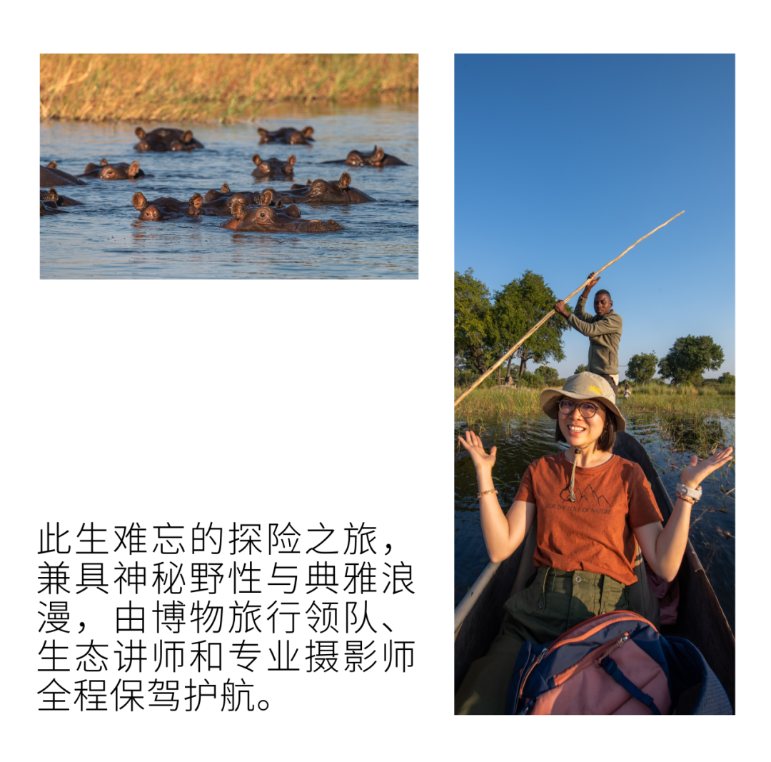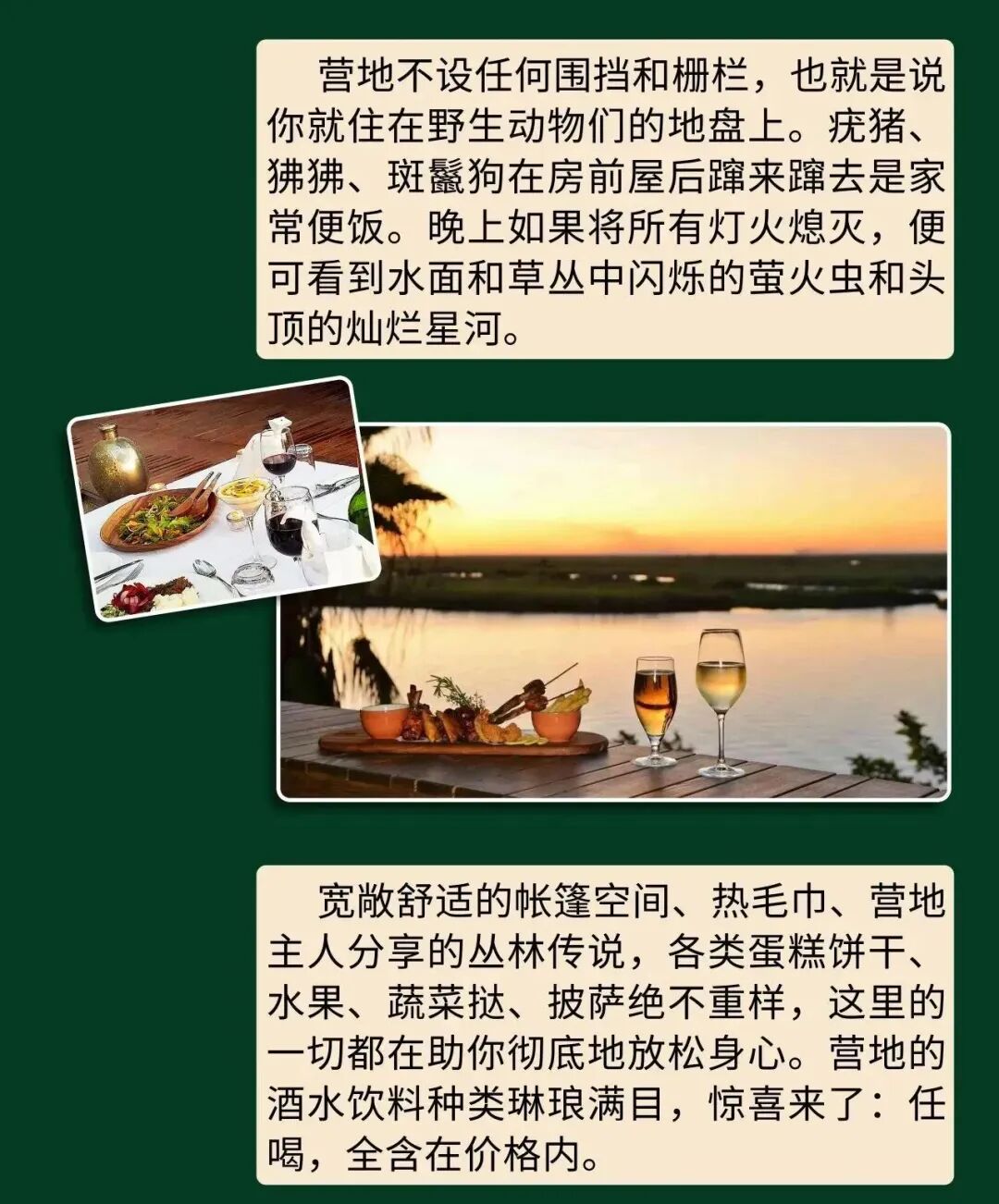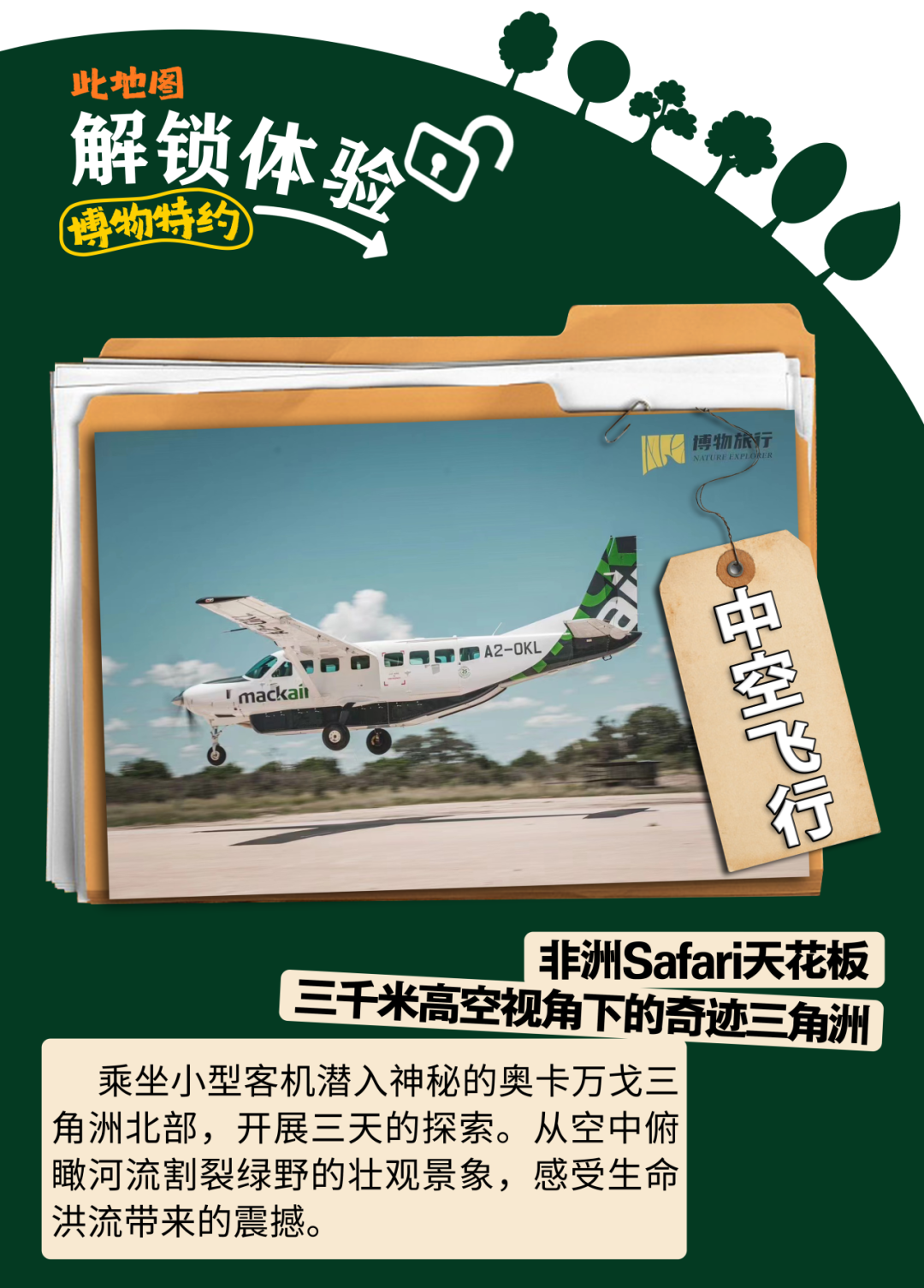 从盐沼出来后,我们即将乘坐小飞机飞入奥卡万戈三角洲—世界上最大的内陆三角洲。落地后,奢华舒适的营地会让大家瞬间放松,就让我们开启三角洲的三日探险吧!