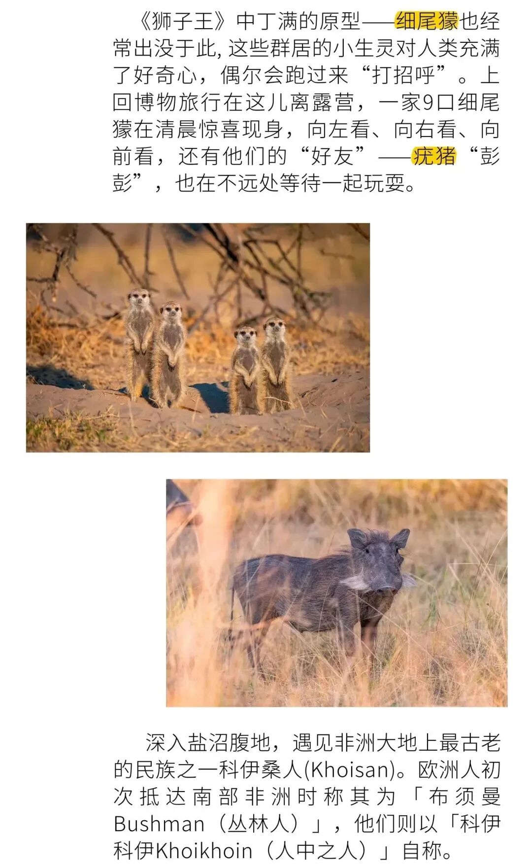 清晨起来,我们将跟随向导在盐沼边的草原上寻找细尾獴一家人的身影。细尾獴是电影《狮子王》中的丁满,它们是一种高度社会性的动物,以群体的方式生活在一起。我们将看到它们集体站立放哨或是奔跑追逐的景象,运气好的话,它们甚至会跳到你的肩膀或是头上。