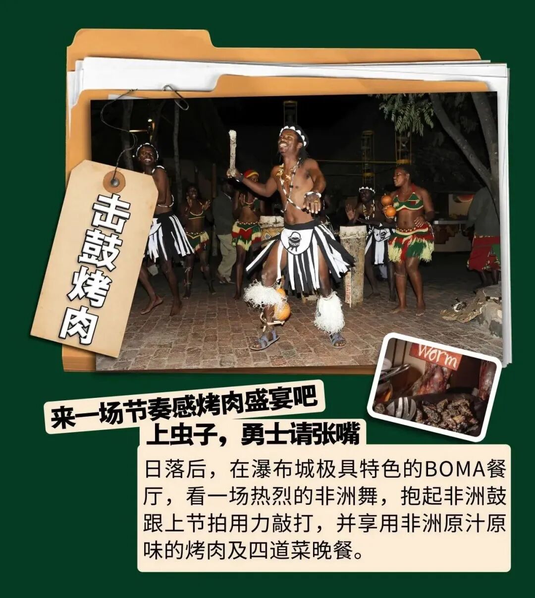 日落后,我们将前往瀑布城最具特色的BOMA餐厅跟随当地人敲响非洲鼓,享用烤肉盛宴。