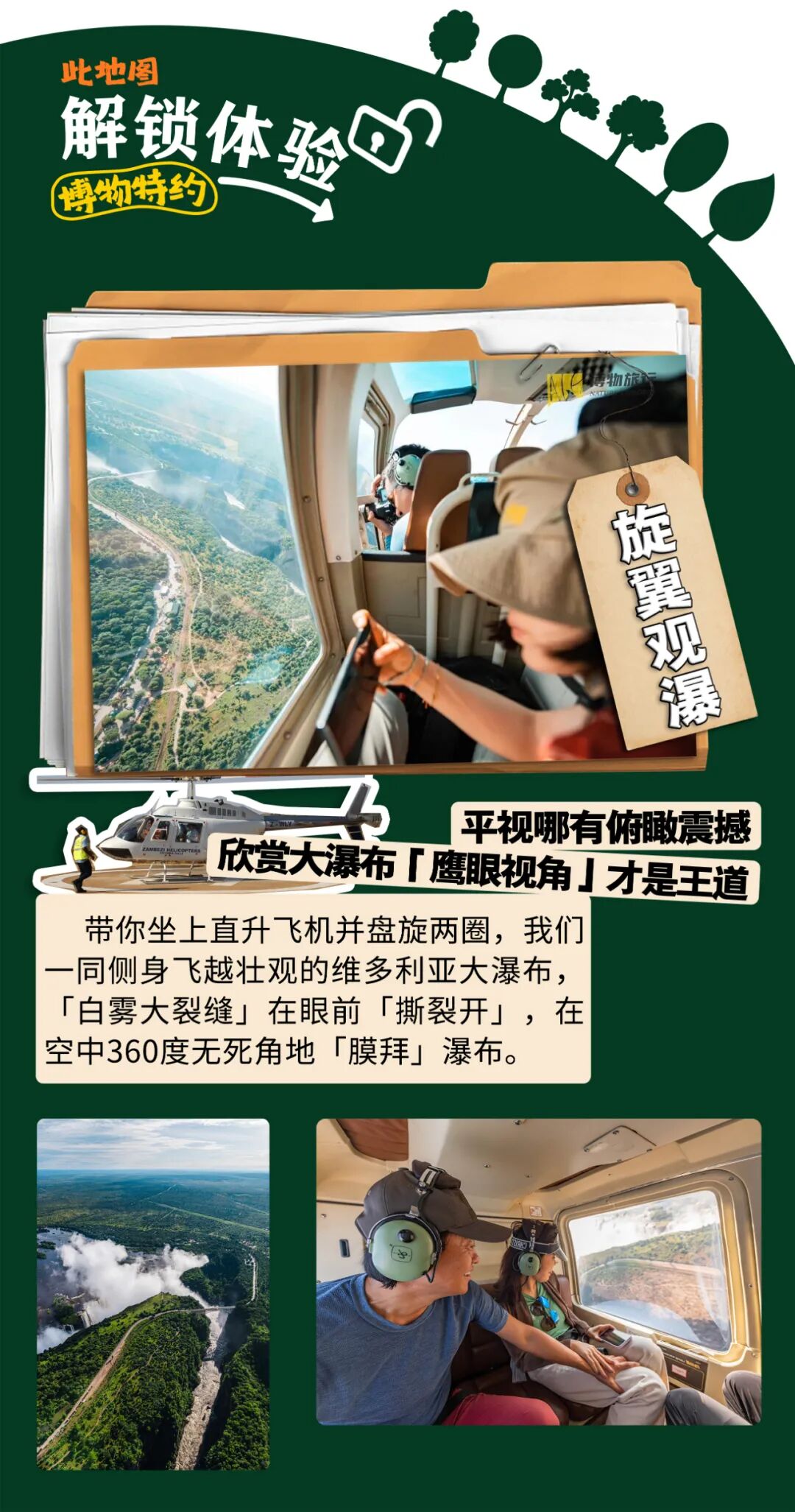 这一天的清晨我们将乘坐直升机,360无死角全面俯瞰维多利亚大瀑布,彩虹在升腾的水汽下更显灵动多彩。