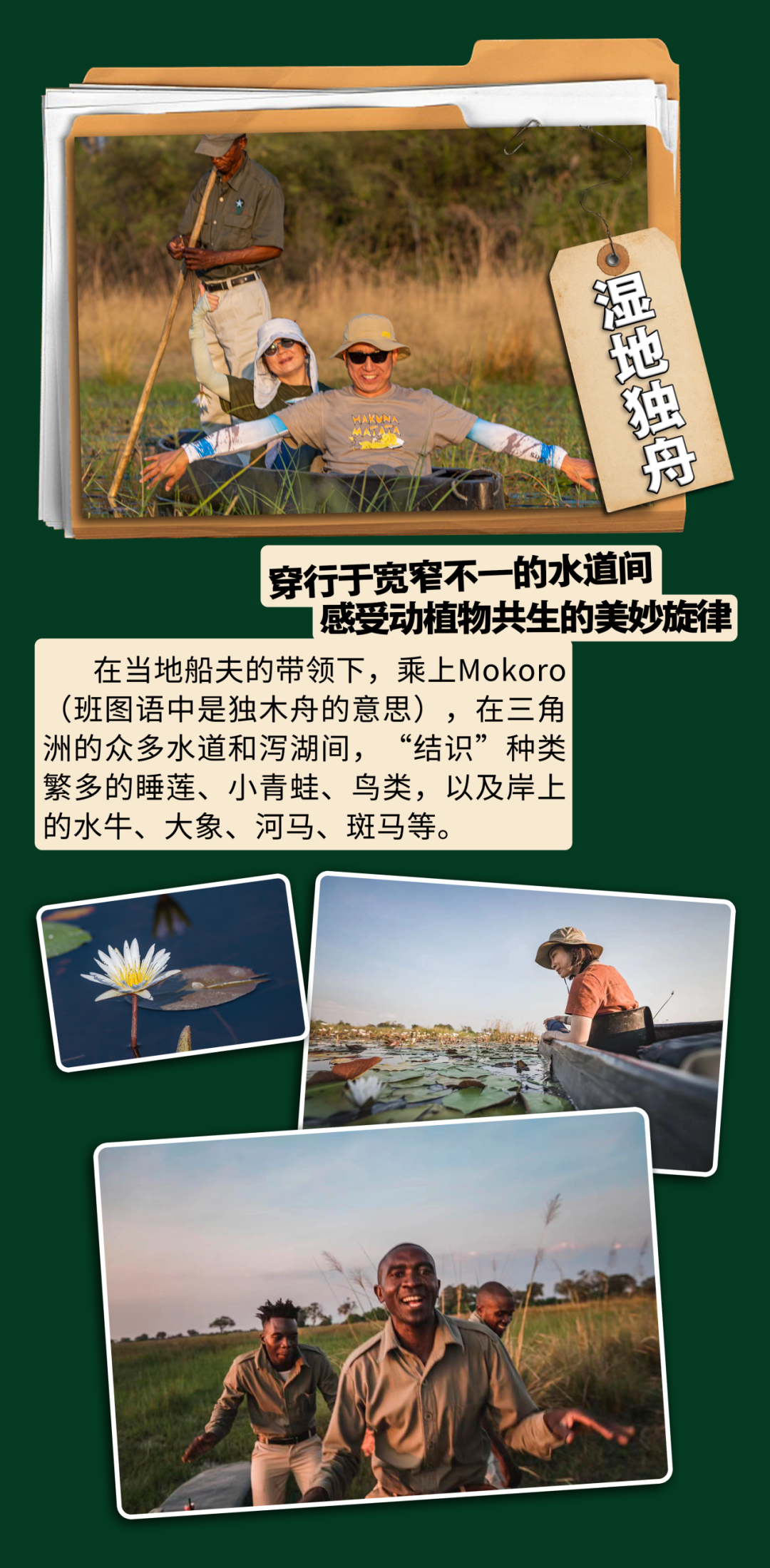 跟随布须曼人船夫,乘上一叶轻舟“Mokoro”,我们将在奥卡万戈的河道中缓缓穿行。在水道和泻湖间,观赏睡莲、各种小青蛙、鸟类以及岸上的水牛、大象、河马、斑马等。