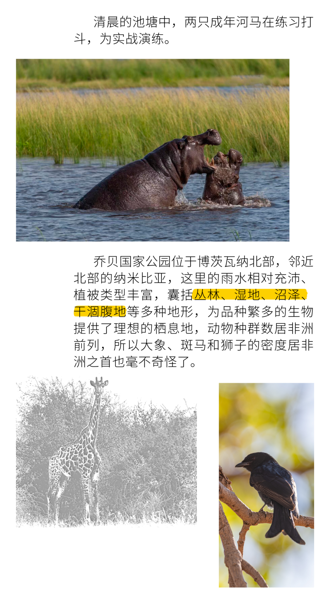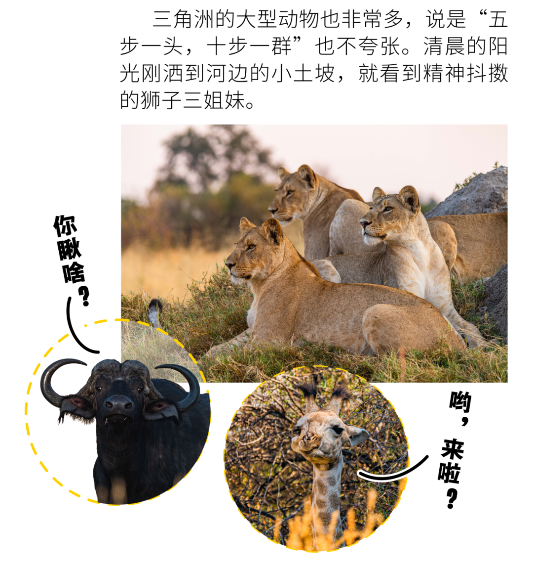 清晨我们的越野车驶进三角州深处,放眼望去,狮子一家在树下乘凉、唠嗑;矫健的豹在大地静待、奔驰、捕食;随处可见的池塘中,河马们在练习打斗。