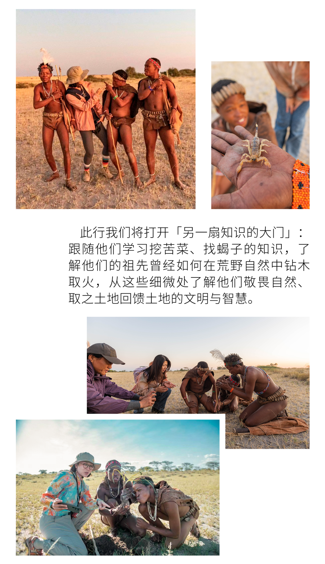 抵达盐沼腹地,我们将去拜访布须曼人,他们是地表最强的捕猎民族,保留着原始的生活方式,他们的生存智慧和对自然的敬畏之心延续至今。
