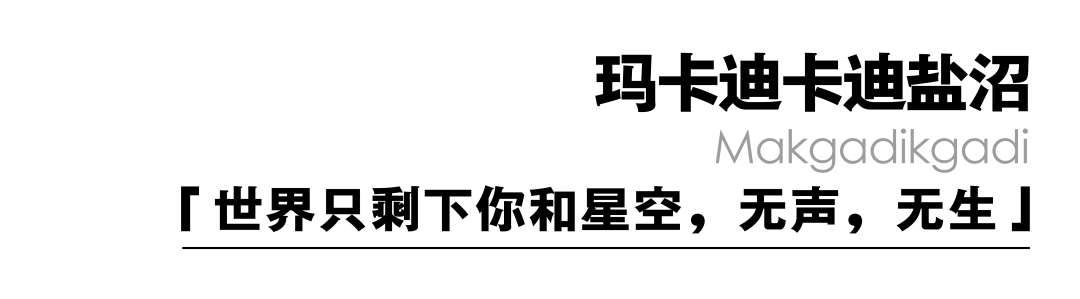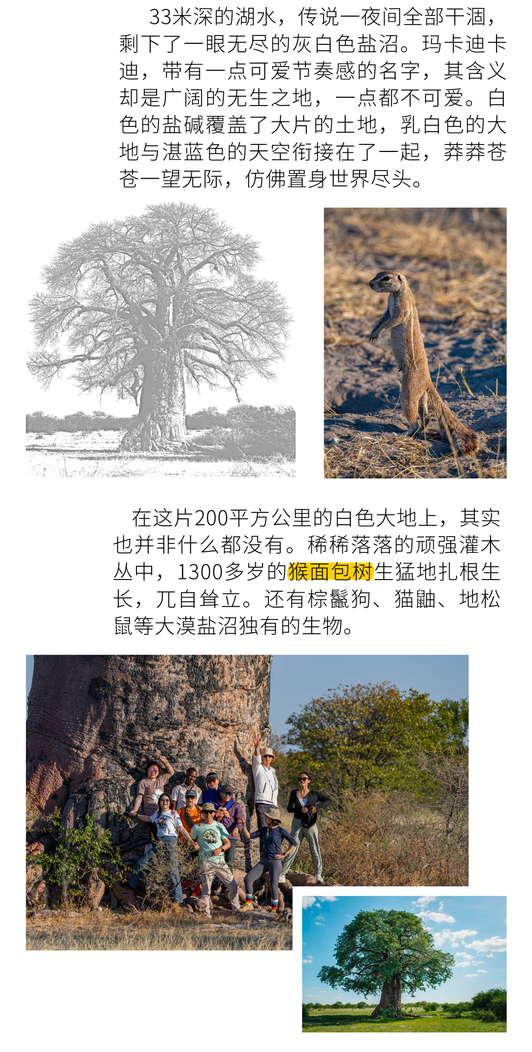 非常值得期待的一天!前往盐沼的路途中,我们会在大象经常出没的水塘小憩,超近距离观察这些大家伙喝水嬉戏的场景。紧接着我们就会前往马卡迪卡迪盐沼,这一路的地形地貌、植物动物都将区分于前几日看到的景象。