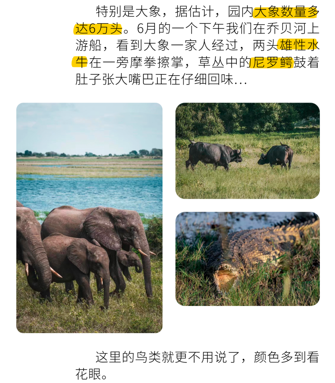 午饭时间,我们会在英伦味十足的维多利亚酒店享用,远眺大桥及峡谷,换个角度领略瀑布风采。接下来我们就要来一场跨国公路之旅了,下午,我们将驱车进入博茨瓦纳境内,向乔贝国家公园进发。傍晚时分,我们将航行在乔贝河中,观察非洲海雕捕食、大象游泳、鳄鱼晒太阳、河马打斗等精彩场面。