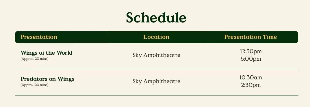 飞禽公园的天际剧场每天都将邀请飞禽动物朋友,为客人们做各种行为展示,以下为时间表: