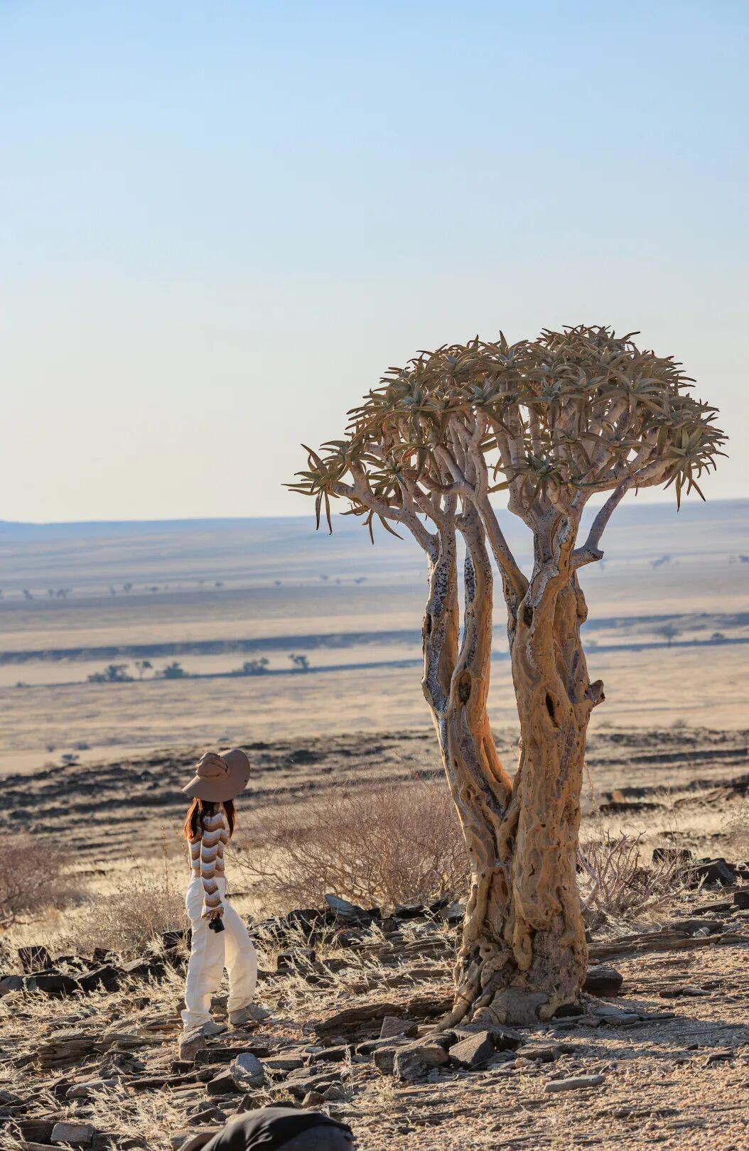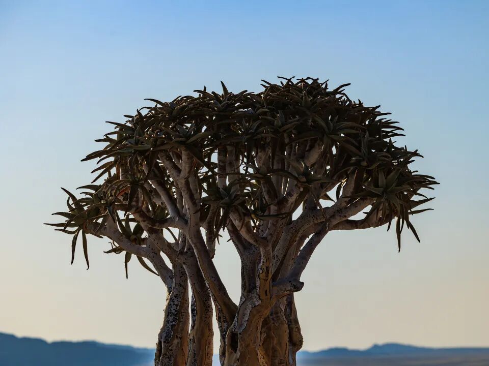 从苏丝斯黎红沙漠前往鲸湾的途中,我们遇见了3棵巨大的箭袋树。作为纳米布沙漠的象征性植物,它们的绝活是:在植株流失水分过多时,“主动”脱落枝干求生。实际上,它们并不是一般意义上的树,而是树状的芦荟。