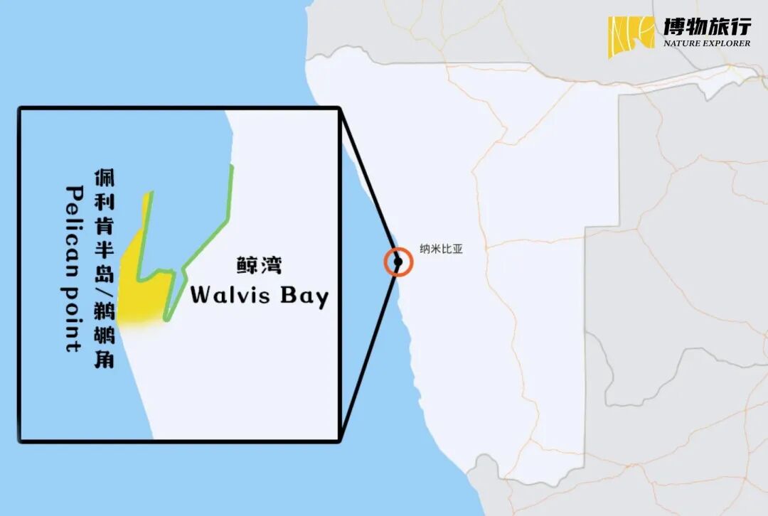 纳米比亚的绵长海岸线,在鲸湾港稍微往里凹一点点,加上西侧佩利肯角半岛遮挡,双重buff的加持下,鲸湾港较为温暖的小气候区域得以形成。