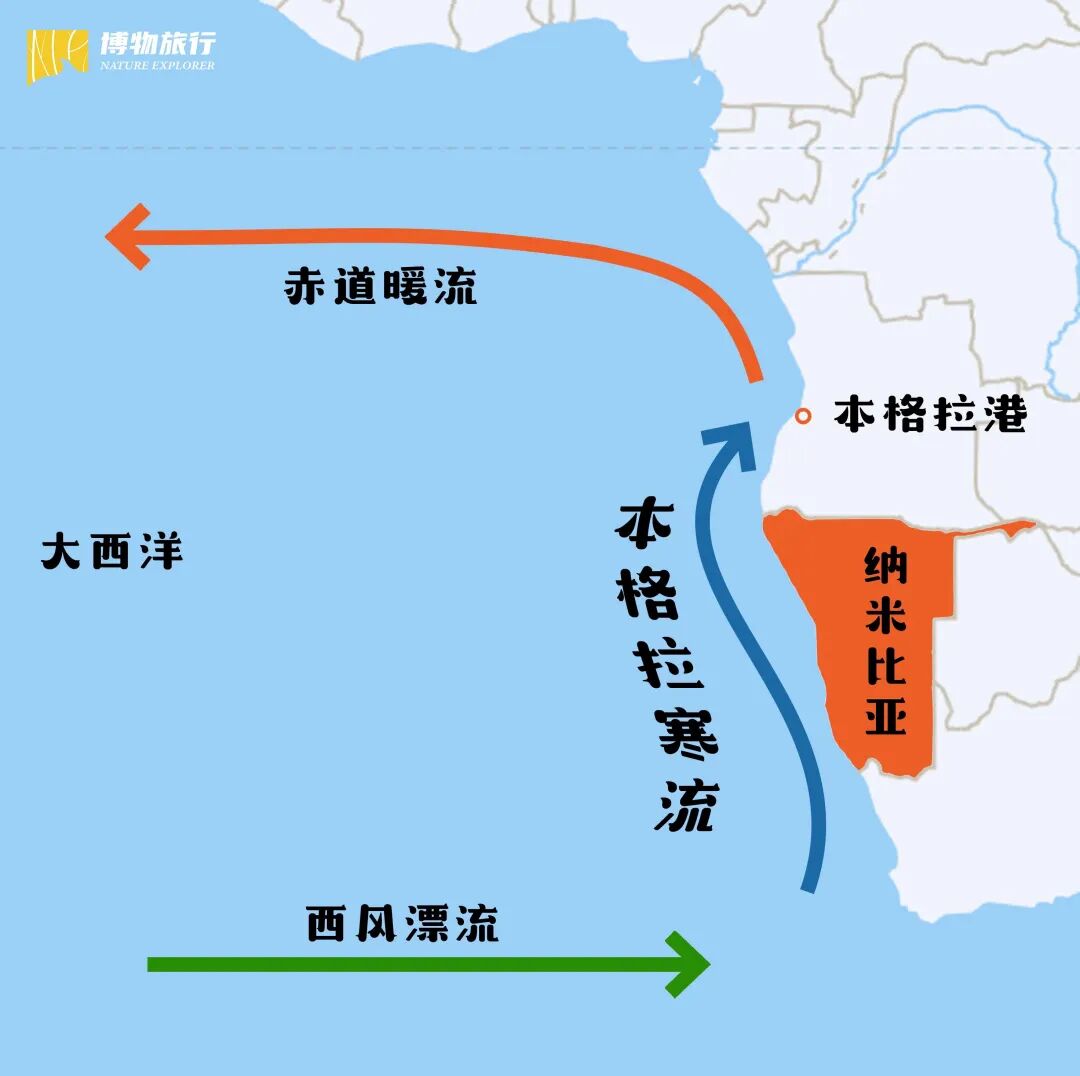 寒冷的西风漂流“撞上”非洲大陆,在季风和地球偏向力等多方因素的共同作用下,它的一部分拐弯沿非洲海岸北上,途径纳米比亚,在安哥拉的本格拉港处汇入赤道暖流。