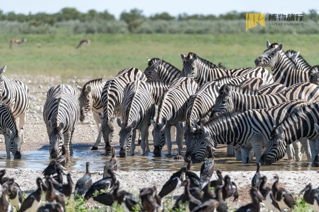 纳米比亚非常干旱,每年降雨量有限,为此,埃托沙国家公园内修建并维护着数十个动物饮水点(waterholes),动物们一般会聚集在水源附近。