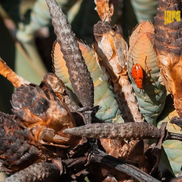 我们在三明治湾附近的月亮谷找到了一株千岁兰,这是远古时代遗留下来的一种植物“活化石”,为世界三大珍稀濒危植物之一,非常珍贵。右下,一只千岁兰臭虫正扒拉着它的球果。