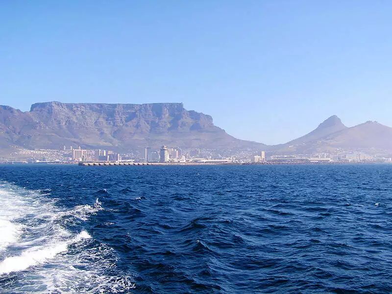 桌山的一边是冷毅的大西洋,一边是温暖的印度洋。两洋的温差使得海水交汇时产生巨大水汽,这水汽升腾,遇到山上的冷空气,便形成了常常漂浮在这桌山的云雾。据说,十七、十八世纪,海上的船只,常常要寻找桌山的影子。最先看到的,要奖励10个银币和葡萄酒。今天,开普敦的人,也常常根据桌山的云雾来判定天气。