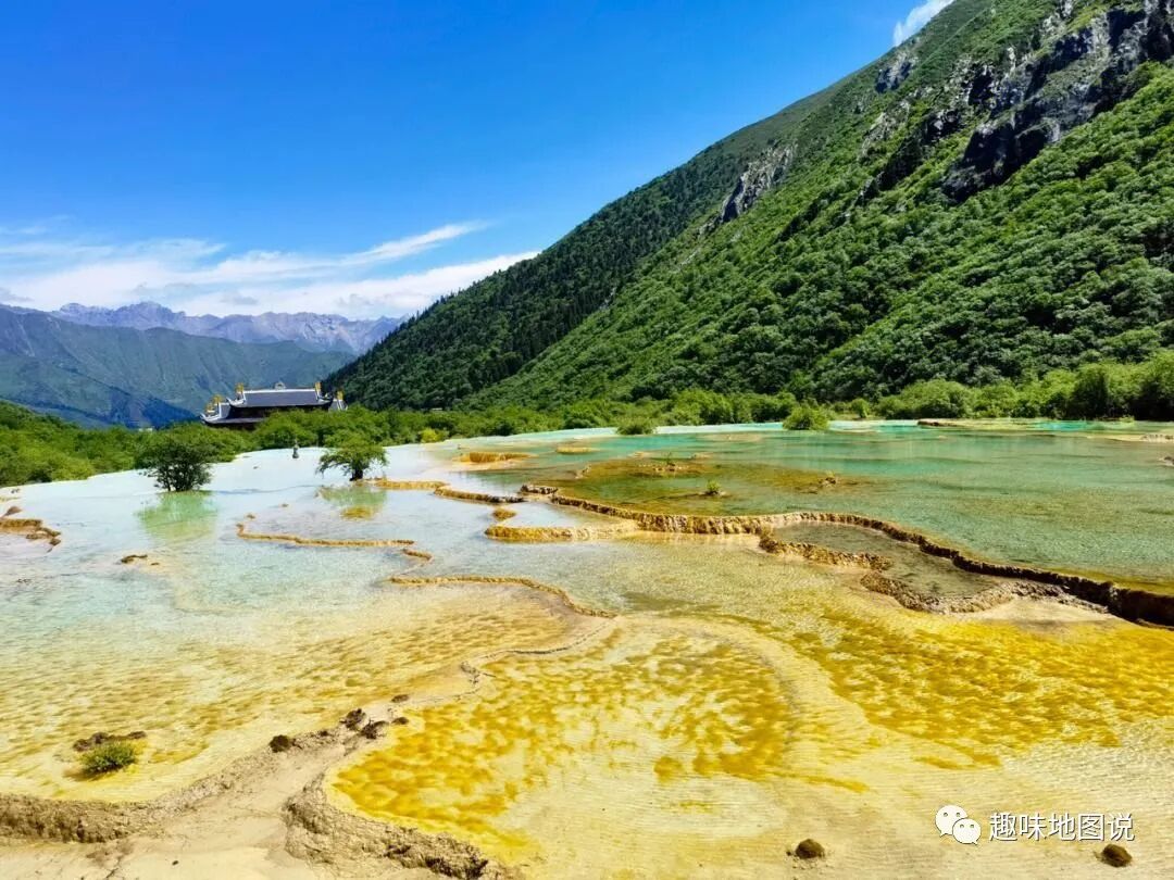 黄龙景区位于阿坝藏族羌族自治州松潘县,以彩池、雪山、峡谷、森林四大景观著称。