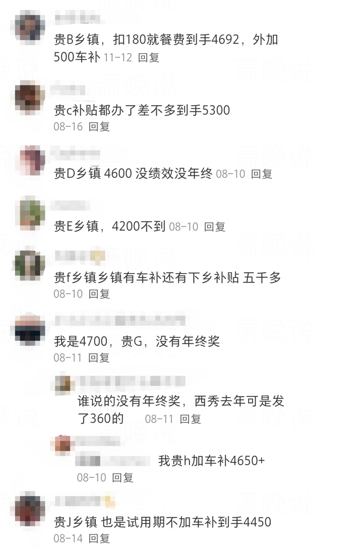 贵B乡镇,扣180就餐费,到手4692,外加500车补;贵C乡镇,补贴都包了,差不多到手5300;贵D乡镇,4600,没绩效,没年终;贵E乡镇,4200不到;贵F乡镇,有车补+下乡补贴,5000多;贵G,4700;贵H,加车补4650+;贵J乡镇,试用期不加车补,到手4450......