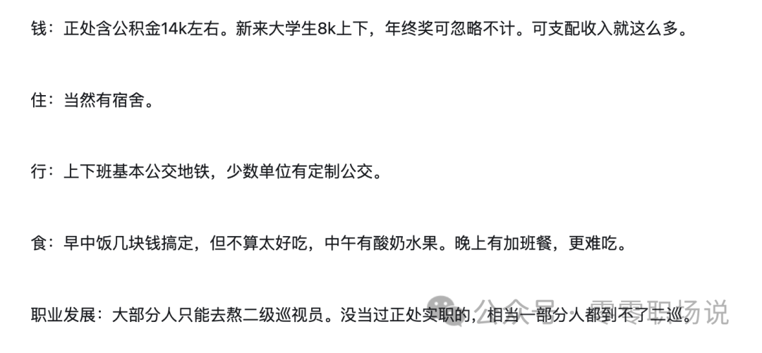 食物方面,早中餐都是几块钱能解决的事情,虽然味道一般,但午餐有额外的酸奶和水果供应。如果加班,晚上也能得到单位提供的加班餐,虽说口味更一般。职业发展上,很多人的目标是熬到二级巡视员,但如果没有担任过正处级实职的话,到达那个位置的机会是相当有限的。