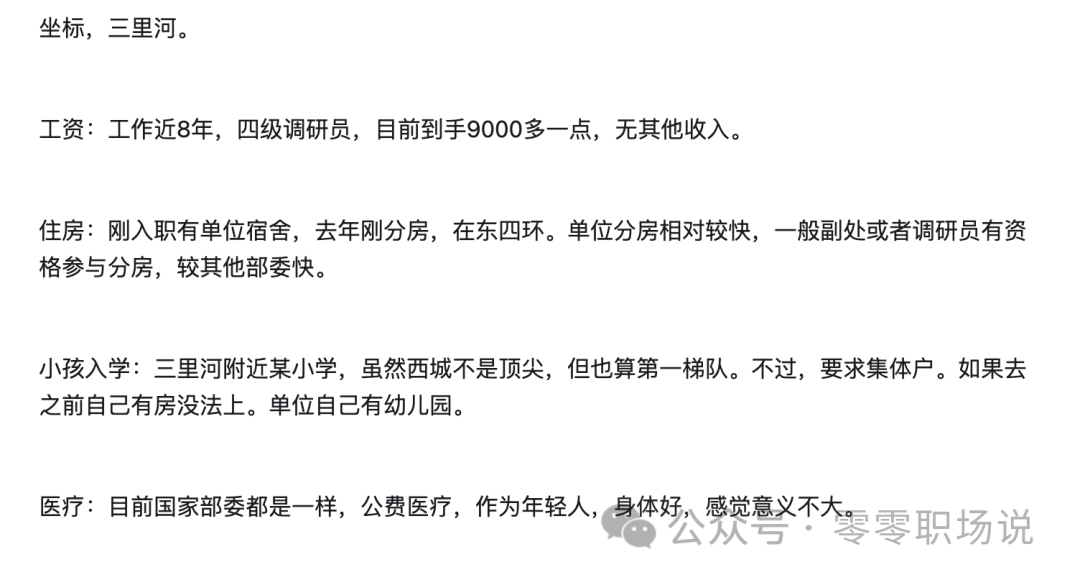 至于子女教育,三里河附近的某小学虽然不是顶尖,但也属于一流。然而,这里有个门槛——要求集体户,这意味着如果事先有了自己的房子,小孩可能就无法在这里上学。医疗方面,国家部委的公费医疗系统对年轻人来说可能感觉作用不大,因为他们身体状况普遍较好。
