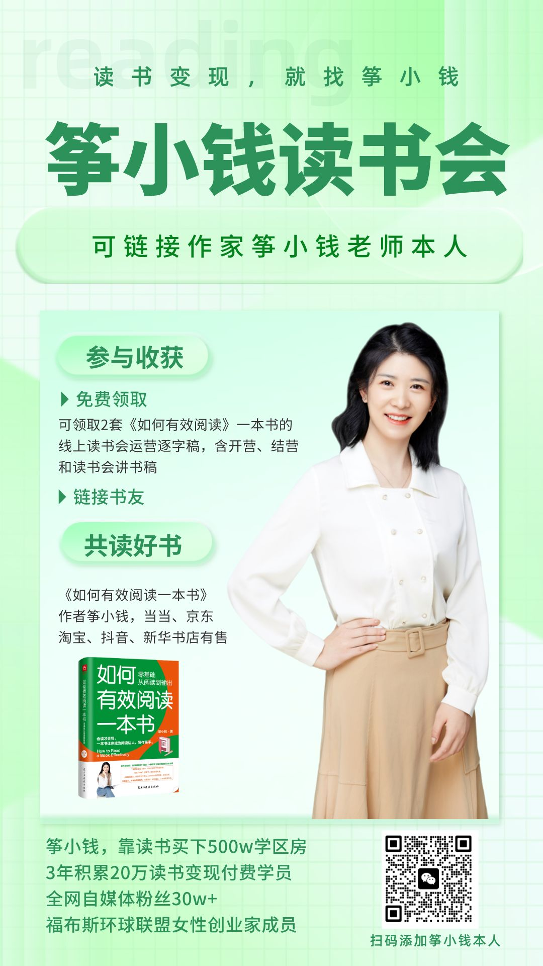 你好,我是职业讲书人筝小钱,《如何有效阅读一本书》作者,靠读书变现买下500万学区房,擅长读书商业化产品设计。