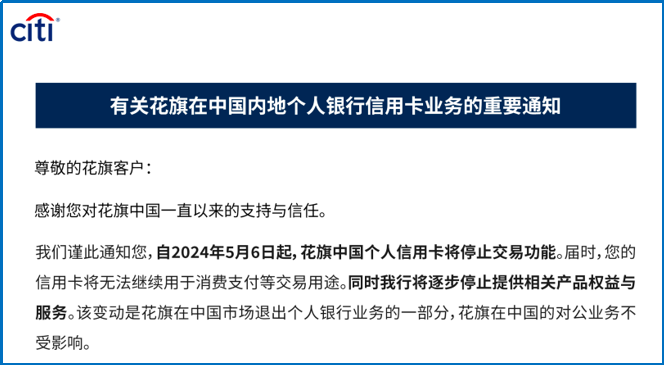 最近两天,素有国际头牌大行之称的花旗银行(中国)有限公司(以下简称“花旗中国”)发布惊人消息,说“自2024年5月6日起,花旗中国个人信用卡将停止交易功能”,同时说“届时,您的信用卡将无法继续用于消费支付等交易用途,同时我行将逐步停止提供相关产品权益与服务”。