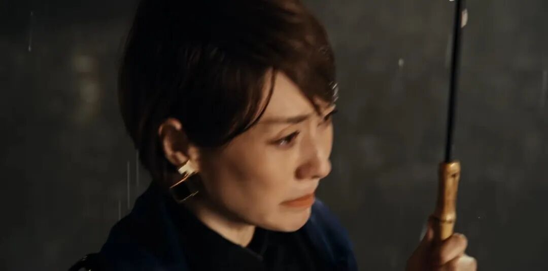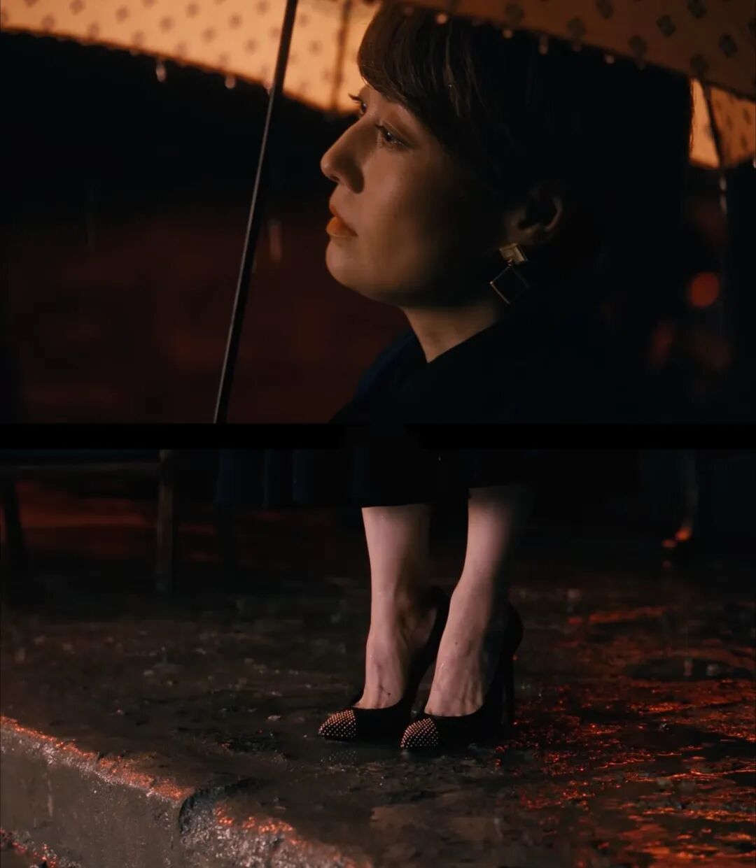 门廊下,脚底精致地高跟鞋被雨水打湿,玲子气恼地跺了一下脚,然后像下定了某种决心,撑伞、昂头,毅然走进雨夜里。